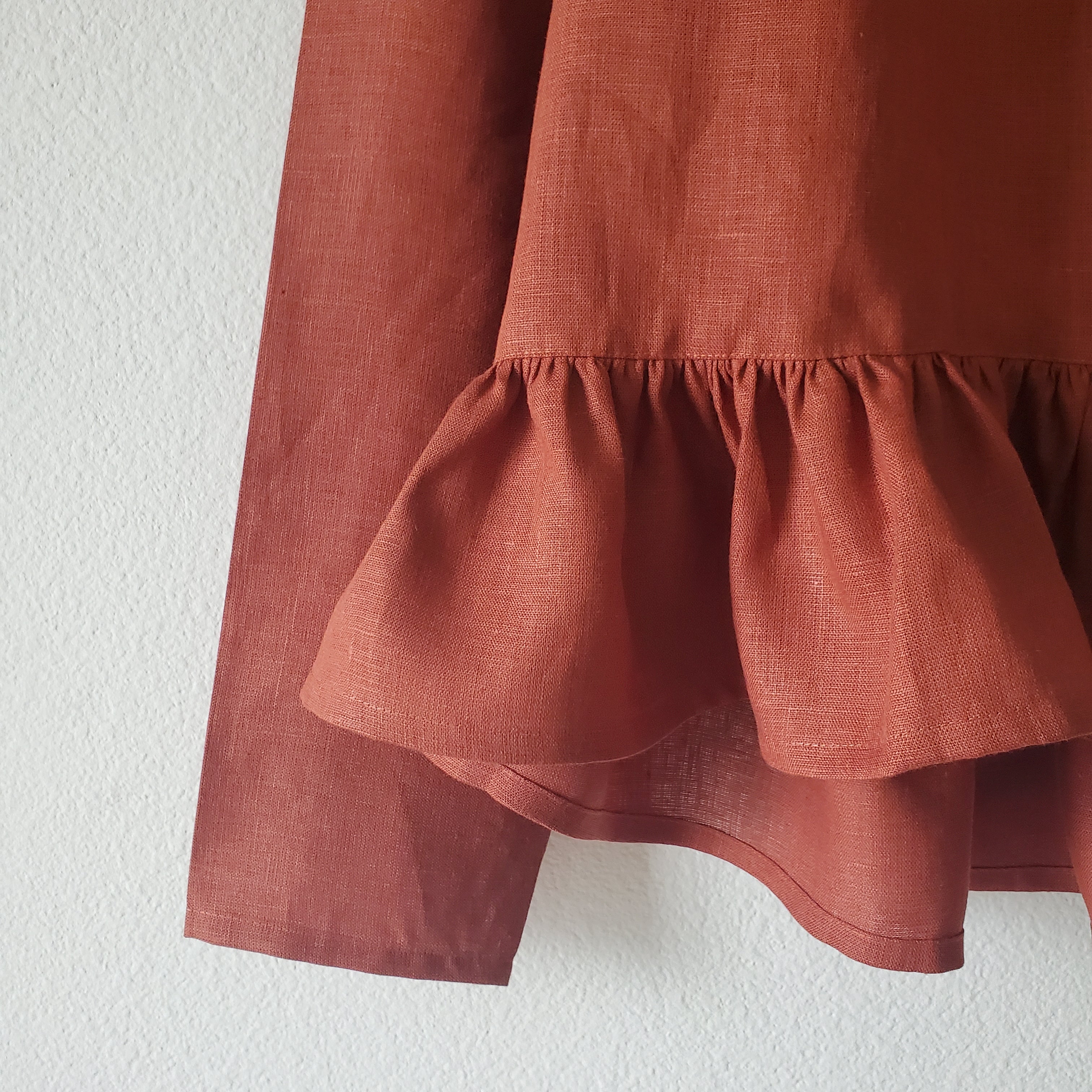 Since all fabrics are unwashed, some color fading and slight shrinkage are expected with the first wash. Linen has a 7-10% shrinkage, which means that it will shrink a bit but not so much as to change its sizing. If you fall on the bigger end of a size bracket, we suggest sizing up for a more relaxed fit.