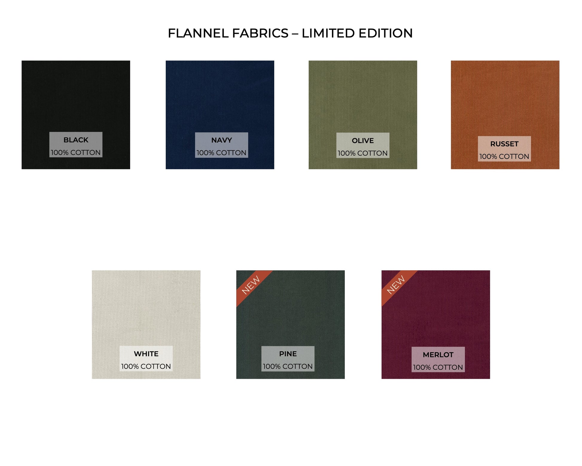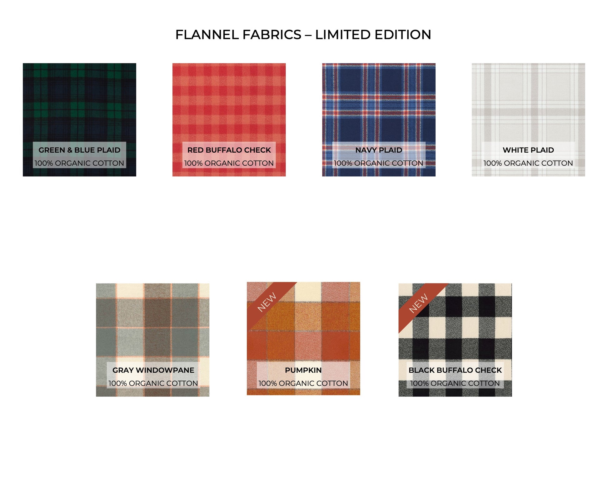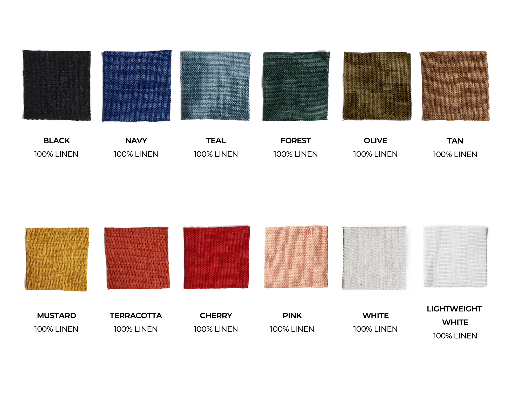 We only use natural fiber fabrics that can vary: 100% linen, 100% cotton, 55% linen and 45% cotton, and 100% hemp.