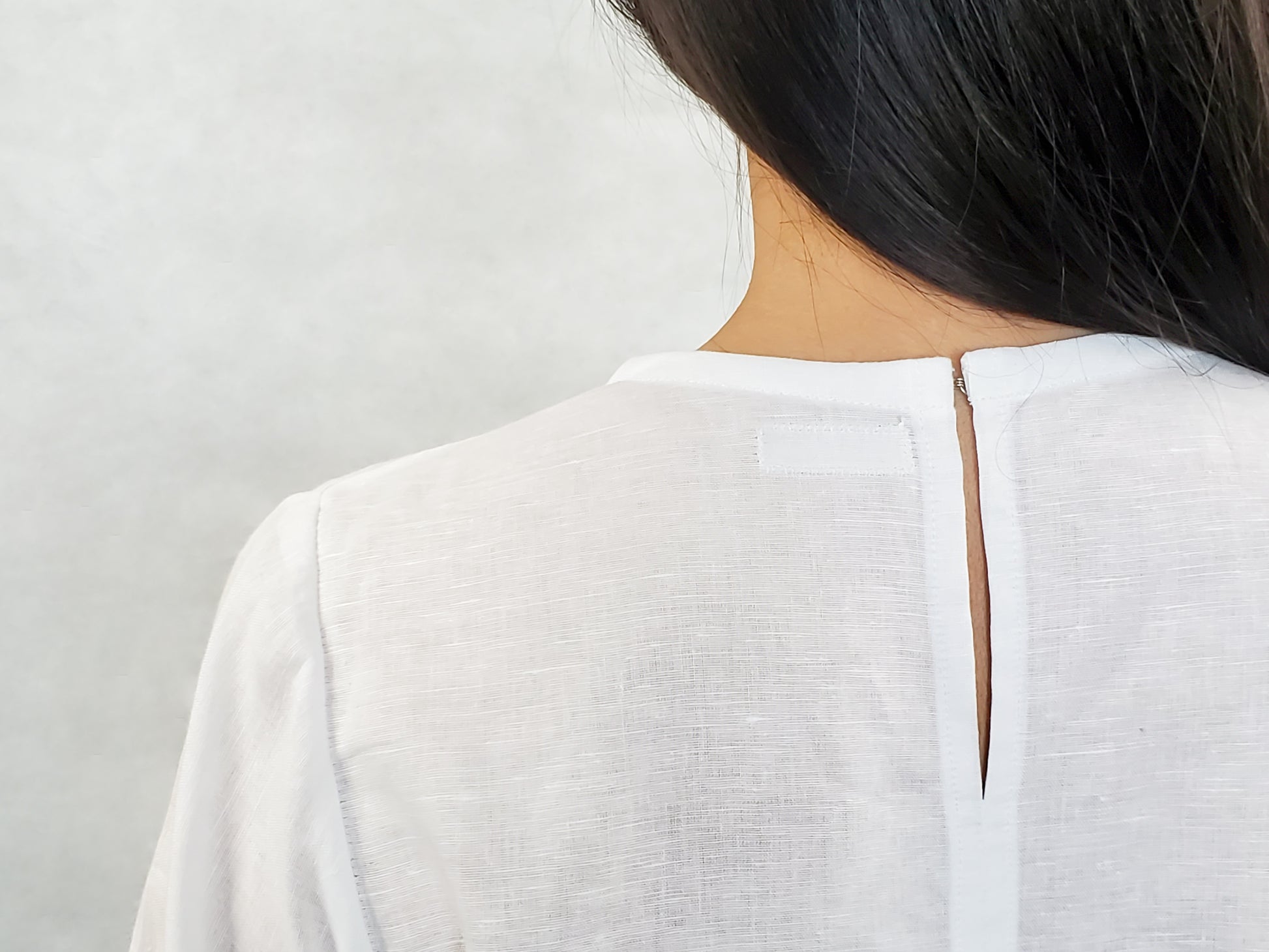 • Crew neckline with hand-stitched hoop and loop back closure.
