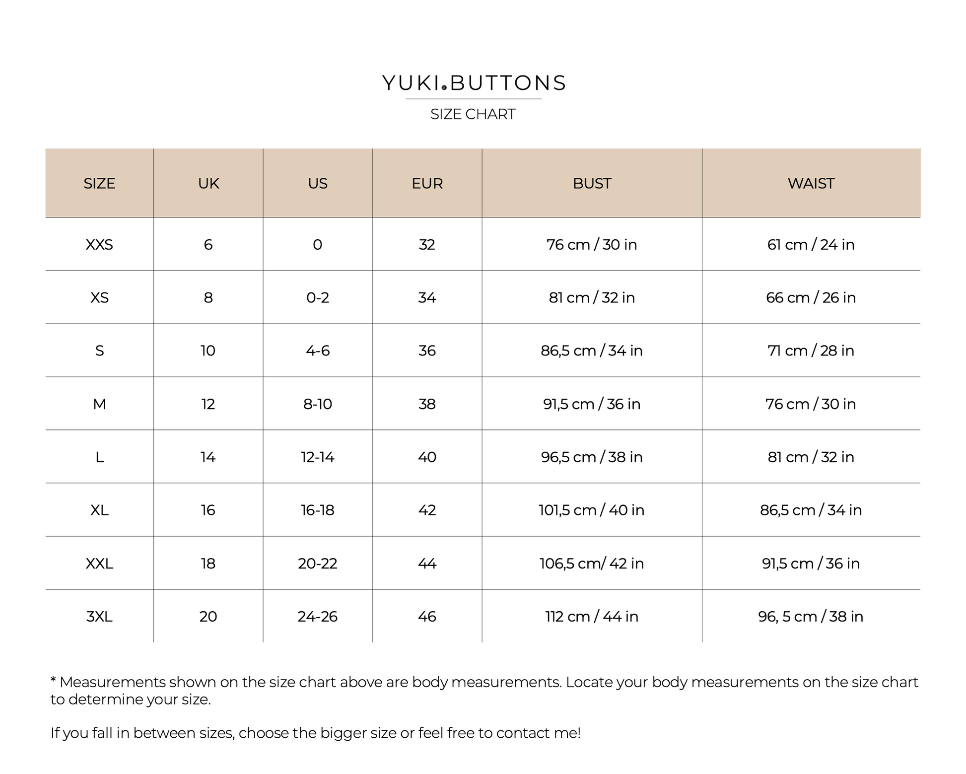 Bottoms: Choose the size based on your hip measurement. If the waist and hip measurements fall on different sizes and wish to have it adjusted, select the size with your hip measurement and leave a note in the "customizations box" with your waist measurement.