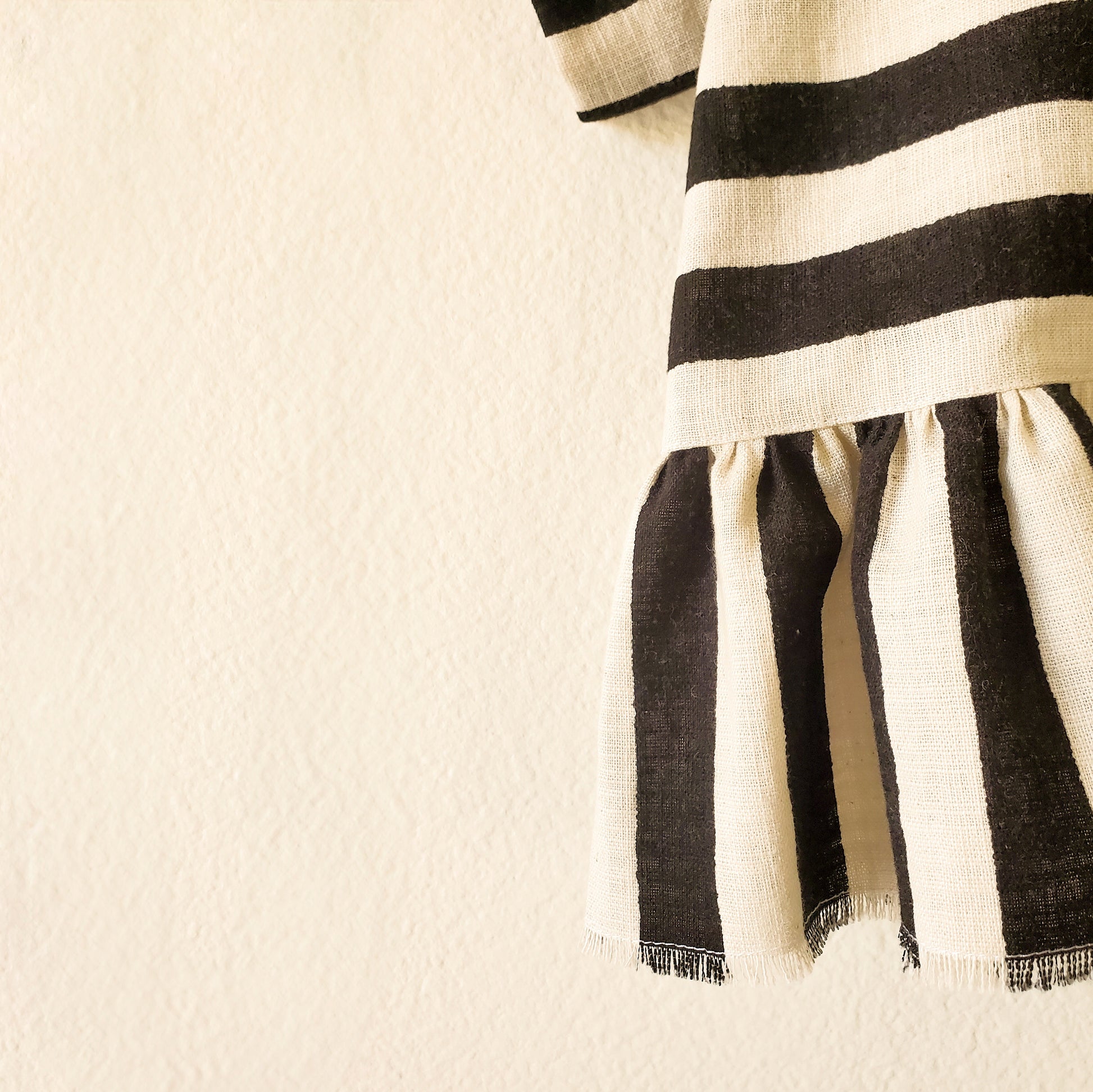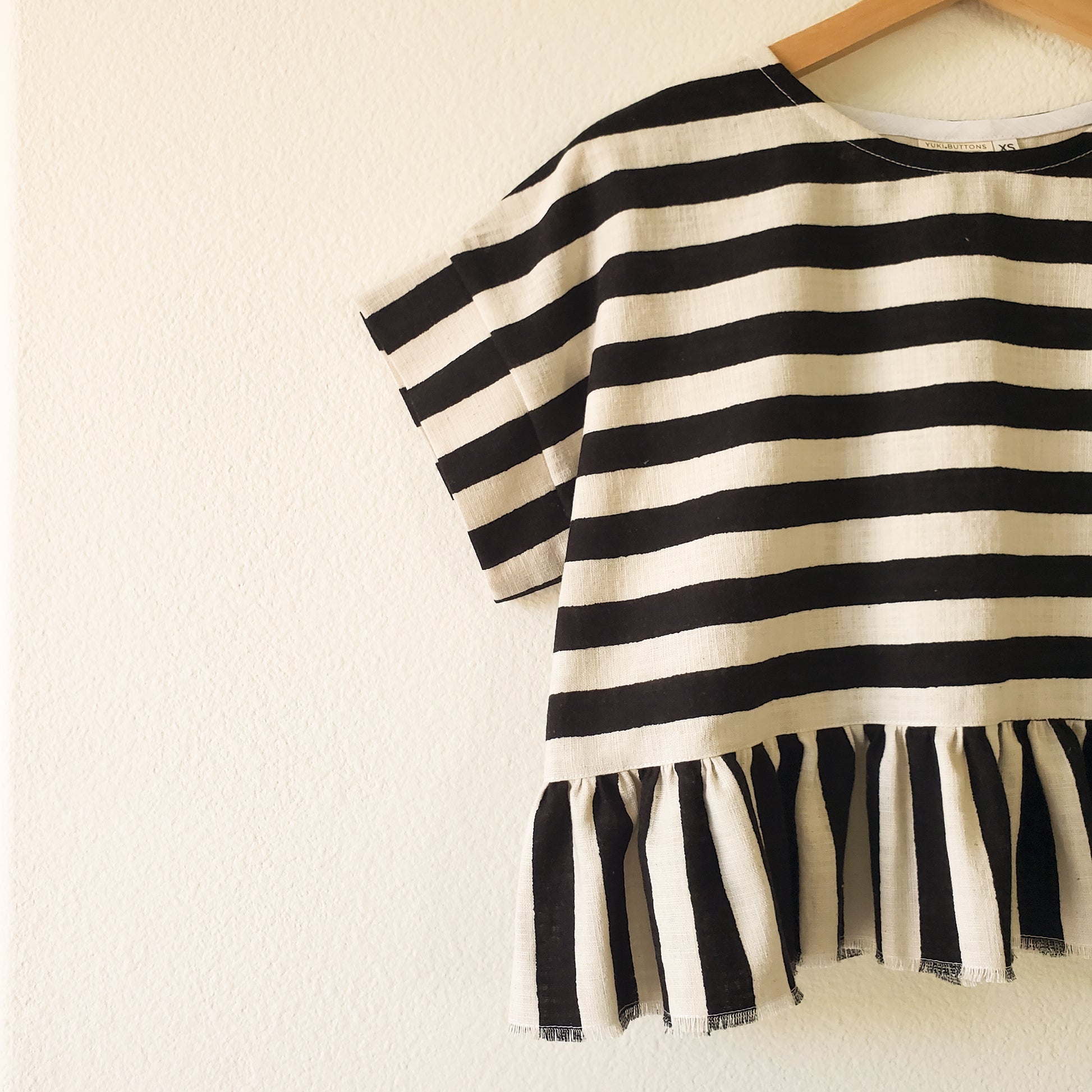 It's the playful sister of the classic Nori Boxy top. She is just as relaxed on the top with dropped down shoulders and cute cuffs, but has a ruffled bottom with raw edges.