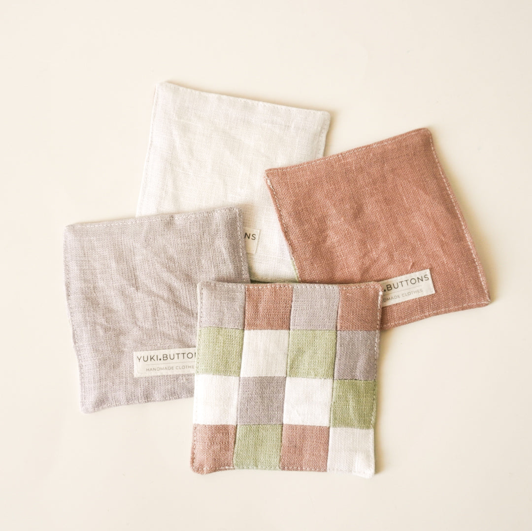 These are zero-waste coasters because they are all made of the smallest fabric scraps resulting from clothes-making. Even the 100% organic cotton wadding is reconstructed with bits from making the Hanten and Sora Jackets. Nothing goes to waste!
