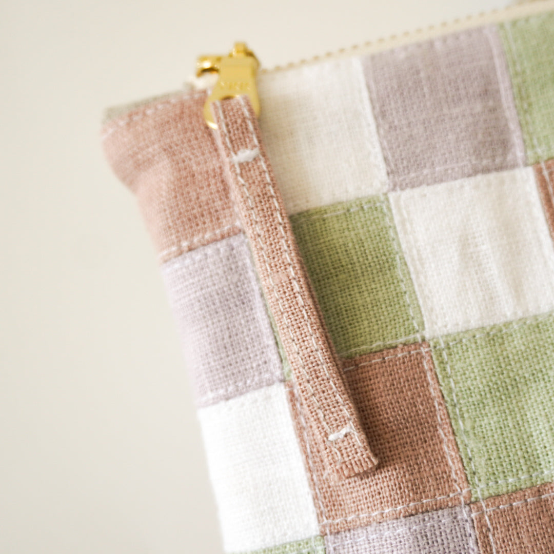 The Patchwork Zipper Pouch No.7 in Marshmallow is a soft color palette that mixes shades of dusty rose, lilac, mint, and white. It's soft and cute just like a rainbow marshmallow!