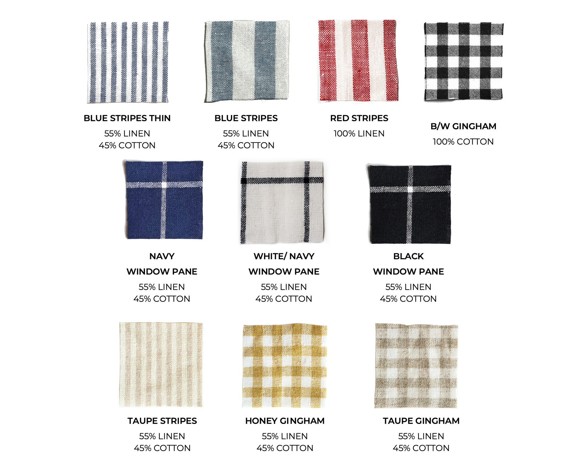 We only use natural fiber fabrics that can vary: 100% linen, 100% cotton, 55% linen and 45% cotton, and 100% hemp.
