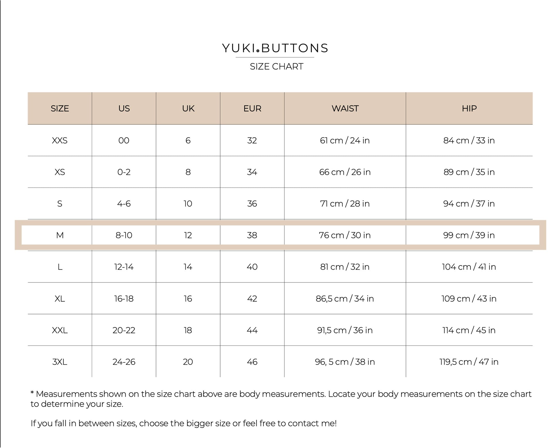 Please check the measurements for the M on the size charts. For this item we recommend selecting the top size based on the bust measurement, and the shorts based on the hips measurement.