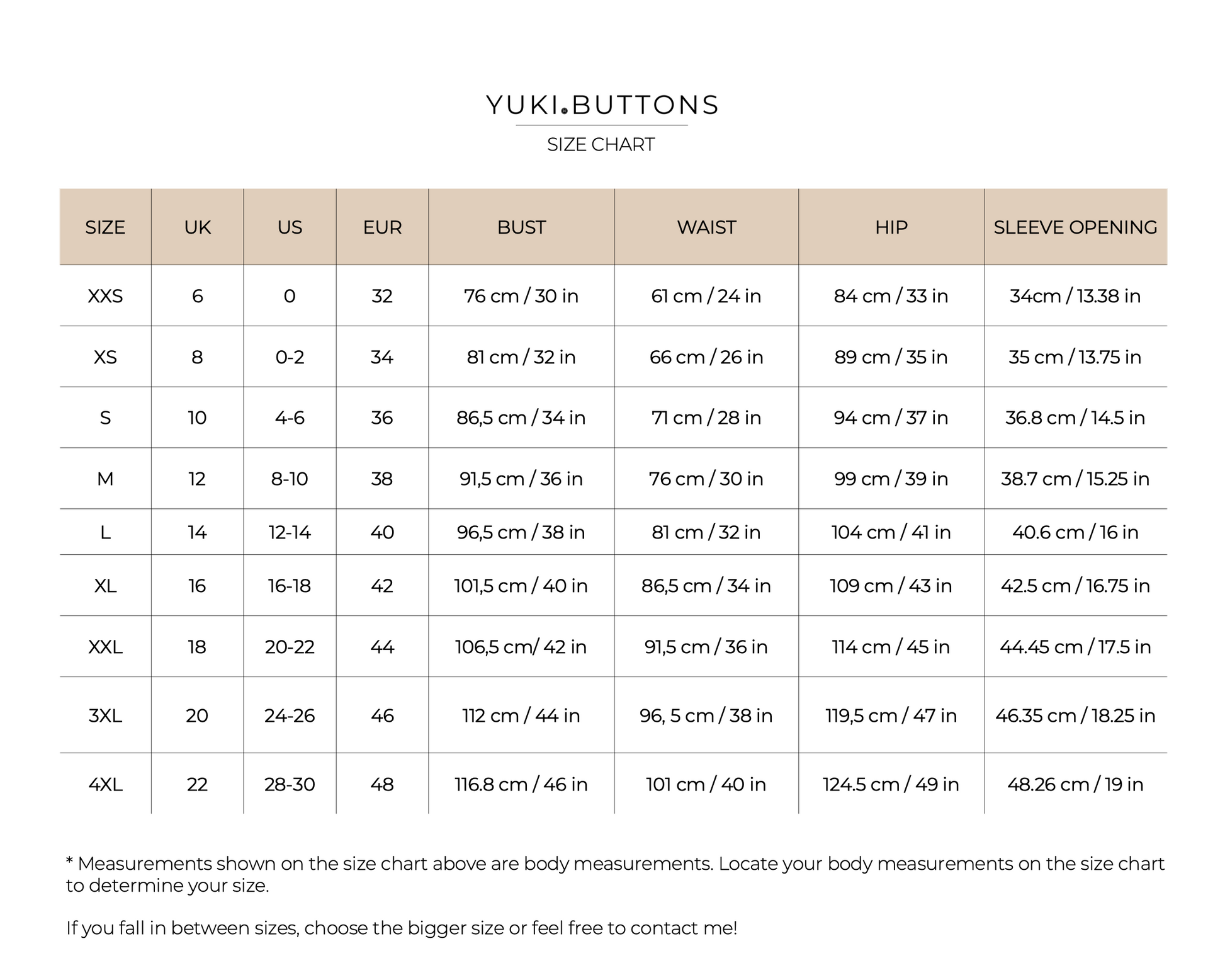 Please reach out if any personalization is needed (i.e., body length adjustment) at hello@yukibuttons.com