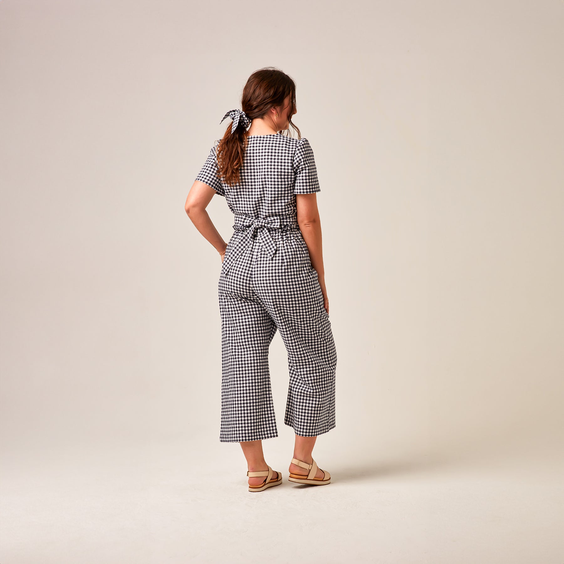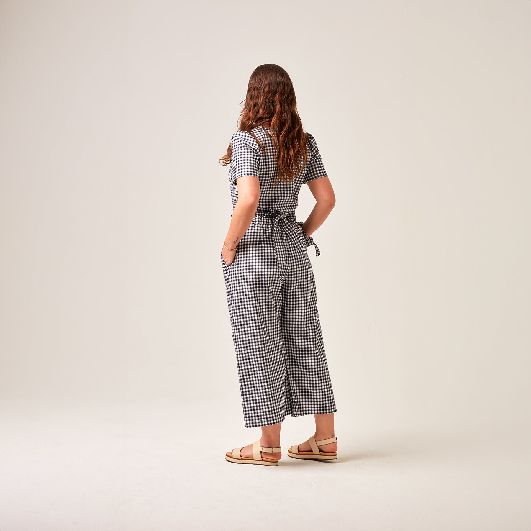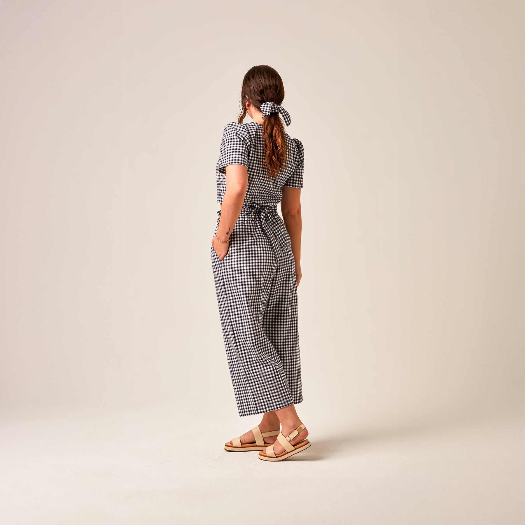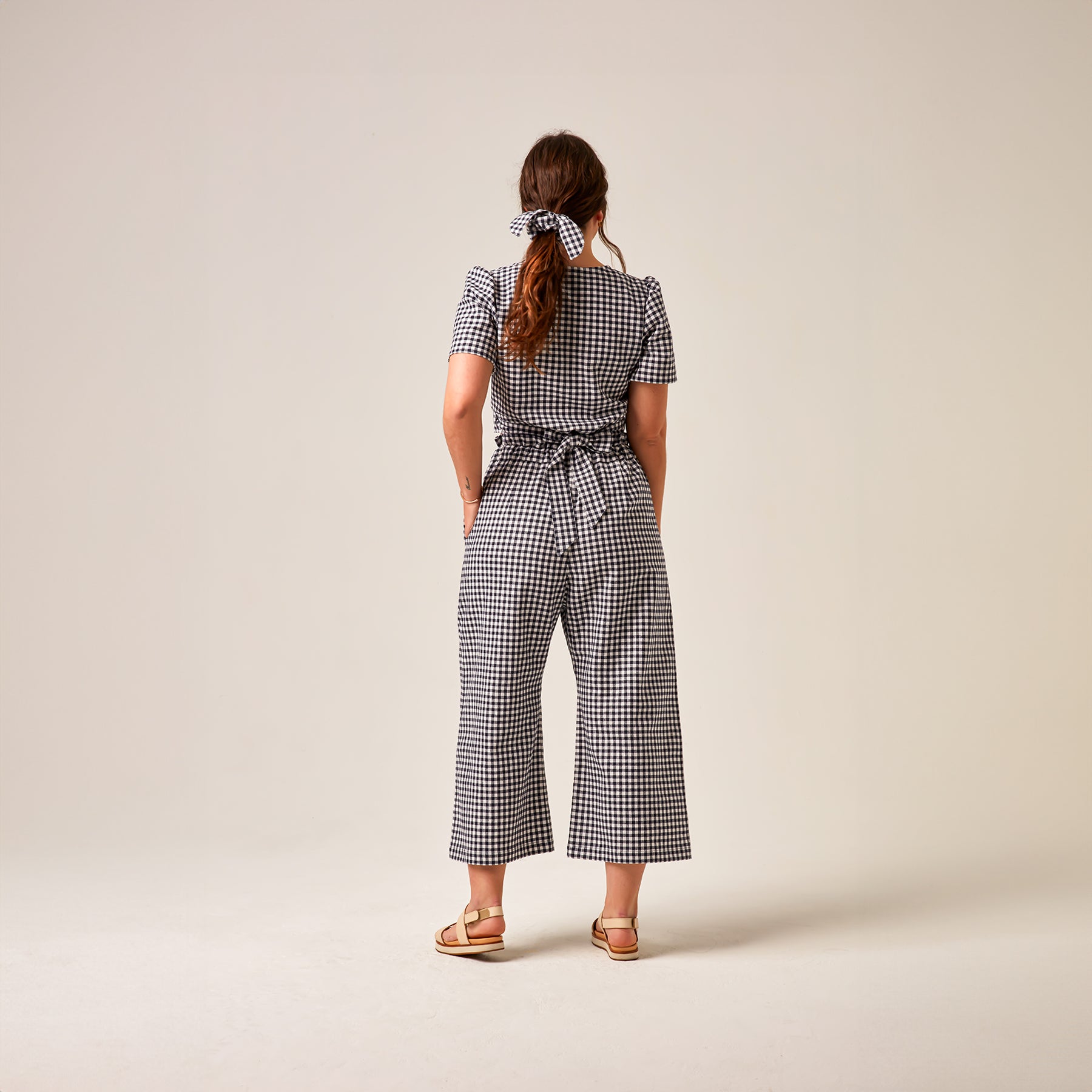 Marina is wearing a size S (small) on top and an L (large) for the bottoms, in Navy Gingham.